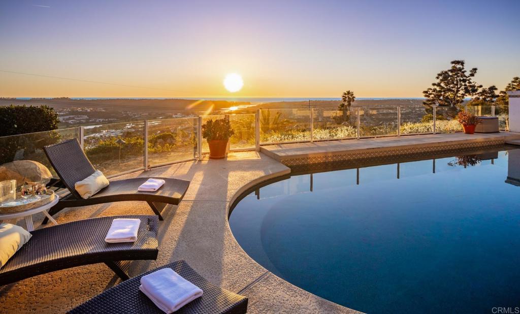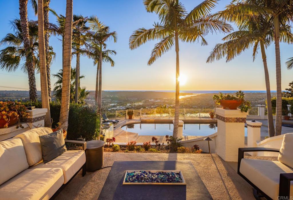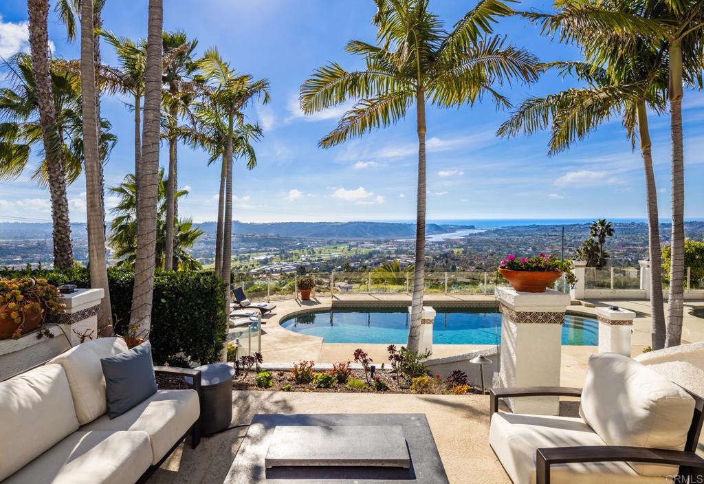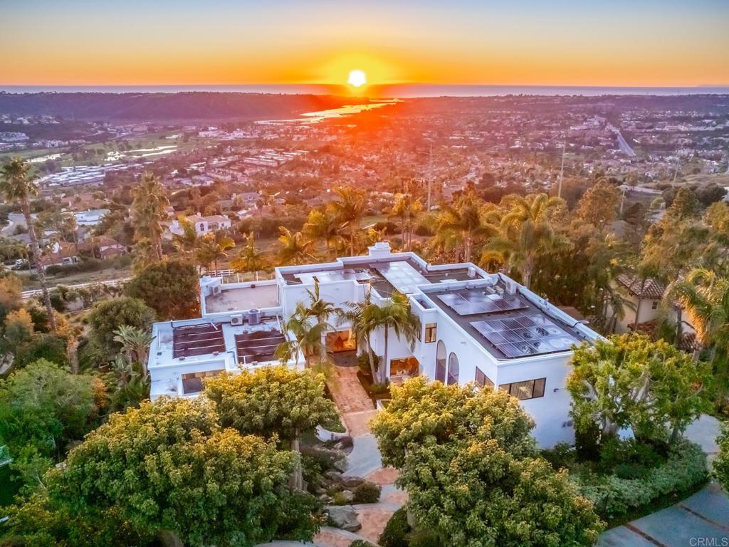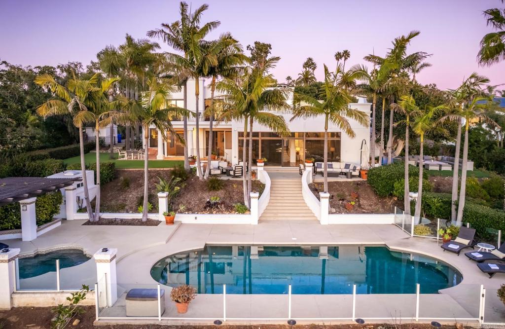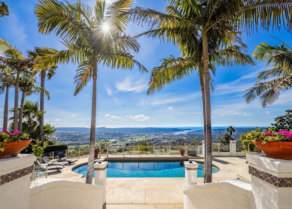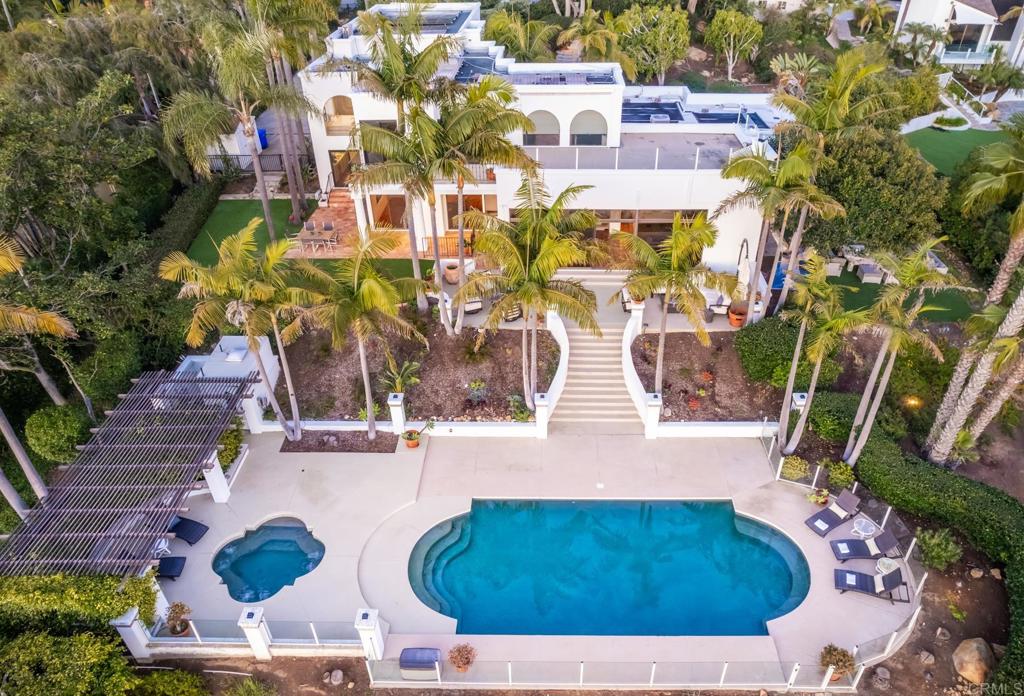 Brilliantly positioned to capture unparalleled lagoon and ocean views that stretch as far as the eye can see. This exceptional gated residence, located within a prestigious enclave of grand La Costa estates, offers nearly 5000 sq ft of sheer opulence. With a generous primary suite, two expansive first floor en-suite bedrooms, two additional second floor bedrooms, a bonus room, and an office, the house caters to a multitude of lifestyles. The magnificent open-concept living room is the heart of the home, adorned with floor-to-ceiling windows that frame the breathtaking panoramas of the expansive backyard, enchanting lagoon, sprawling golf courses, endless sunsets, and ocean views. Cater to your culinary passions in the remodeled chef's kitchen, featuring a large center island and top-of-the-line appliances such as Viking, Sub Zero, Miele, and Wolf, with a 6-burner gas stove, double oven, warming drawer, full-size wine refrigerator, and an array of other high-end amenities. Entertain with ease in the separate formal dining room with a fireplace and adjacent wet bar, or retreat to the outdoor dining area and poolside cabana, all while basking in the rare beauty of unobstructed 180 degree views. A dramatic spiral staircase leads you to the top-floor primary suite, complete with a fireplace and expansive balcony, and a spa-like primary bath with an ocean view bathtub, separate shower, multiple vanities and a large walk-in closet. The second level features a separate wing or in-law suite with two additional bedrooms, a full bath, an office, and a lovely living room, providing ample space for work, relaxation, and entertainment. With a sprawling 37,000 sq ft lot, the nearly one-acre estate is private on all sides, and offers multiple outdoor areas for tranquil enjoyment or hosting gatherings, including a lush side yard with seating area, a large garden with a stone meditation path, and a stunning pool area with cabana and full bath. Additional features include a three-car garage, paid solar panels and pool solar, electric car charger, new HVAC, tankless water heater and more, ensuring every comfort and convenience. This is a rare opportunity to acquire a slice of paradise, conveniently situated near premier shopping centers, golf courses, resorts, schools, theaters, and all the amenities one could desire.