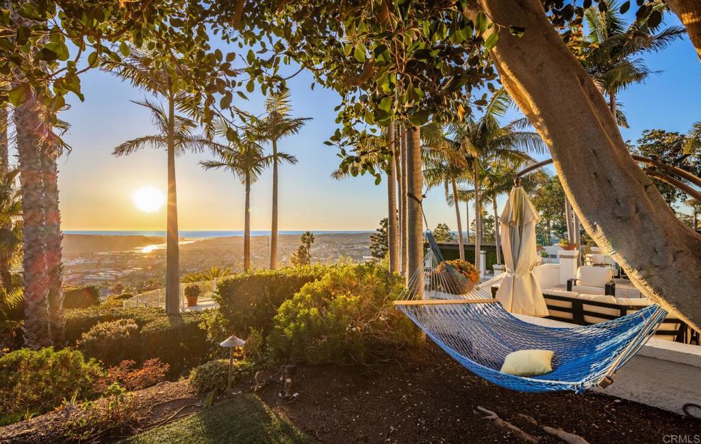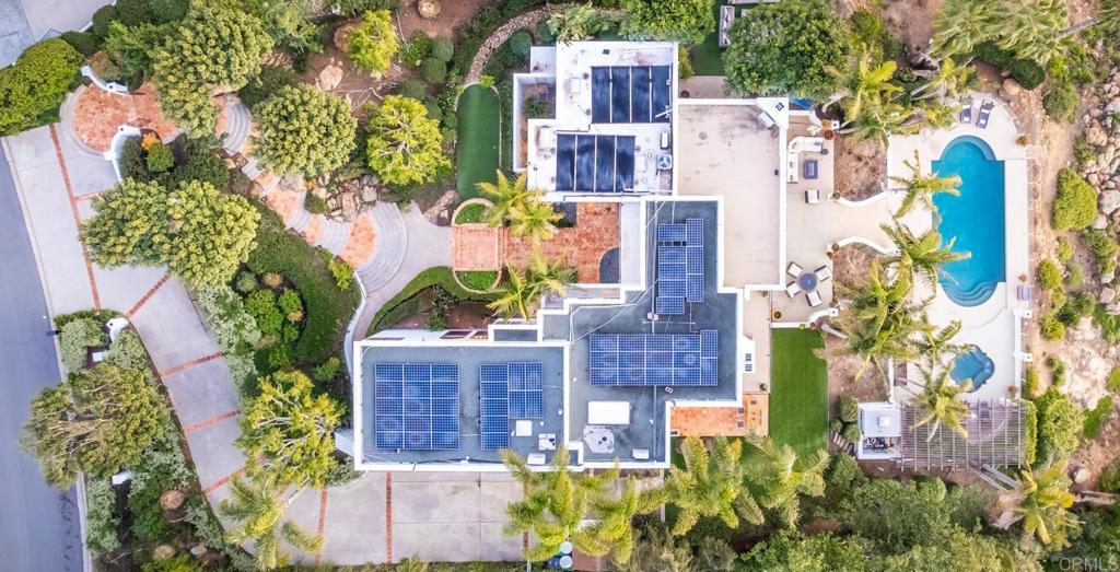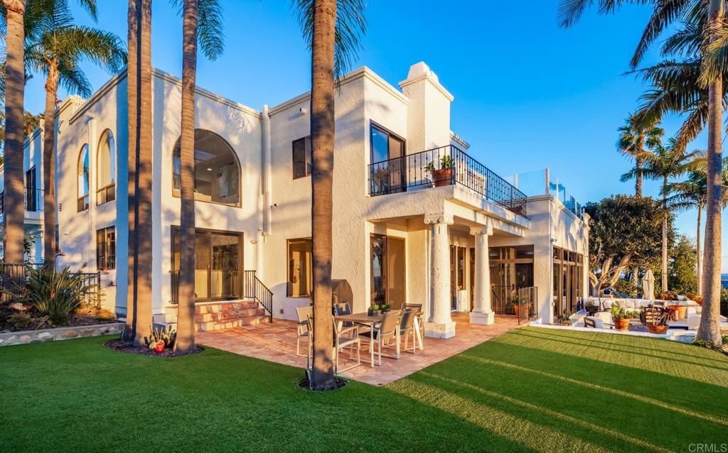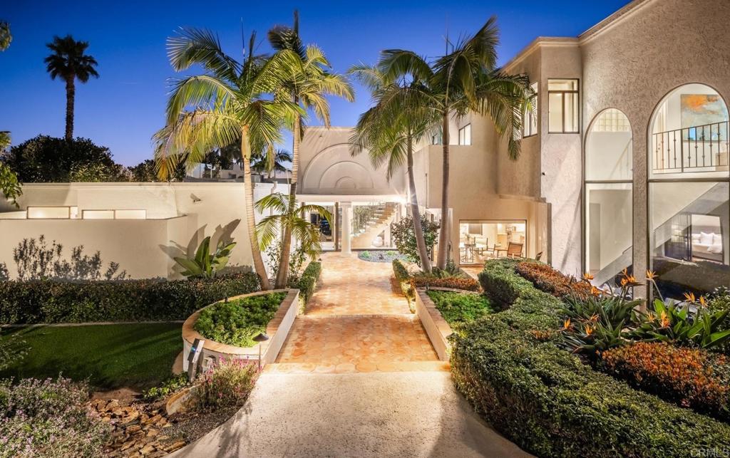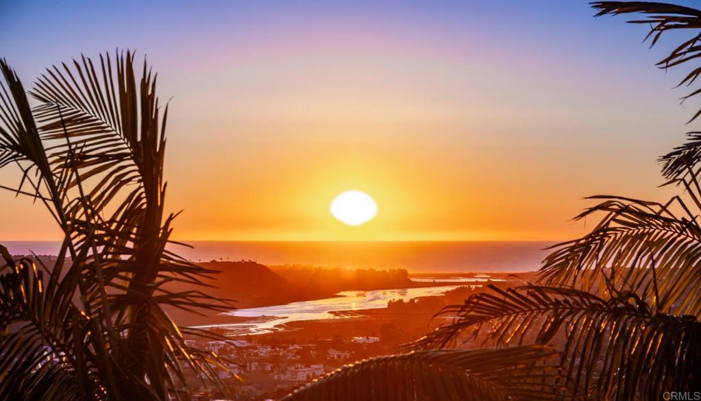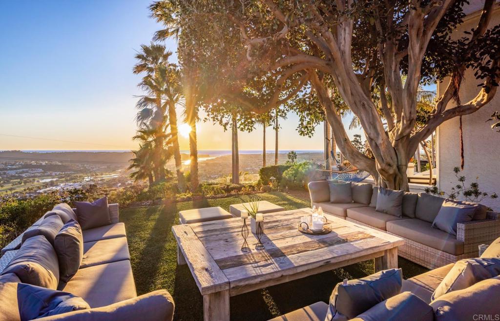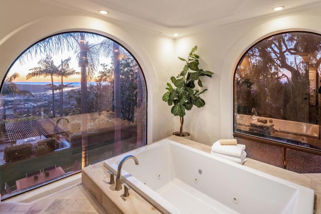 Brilliantly positioned to capture unparalleled lagoon and ocean views that stretch as far as the eye can see. This exceptional gated residence, located within a prestigious enclave of grand La Costa estates, offers nearly 5000 sq ft of sheer opulence. With a generous primary suite, two expansive first floor en-suite bedrooms, two additional second floor bedrooms, a bonus room, and an office, the house caters to a multitude of lifestyles. The magnificent open-concept living room is the heart of the home, adorned with floor-to-ceiling windows that frame the breathtaking panoramas of the expansive backyard, enchanting lagoon, sprawling golf courses, endless sunsets, and ocean views. Cater to your culinary passions in the remodeled chef's kitchen, featuring a large center island and top-of-the-line appliances such as Viking, Sub Zero, Miele, and Wolf, with a 6-burner gas stove, double oven, warming drawer, full-size wine refrigerator, and an array of other high-end amenities. Entertain with ease in the separate formal dining room with a fireplace and adjacent wet bar, or retreat to the outdoor dining area and poolside cabana, all while basking in the rare beauty of unobstructed 180 degree views. A dramatic spiral staircase leads you to the top-floor primary suite, complete with a fireplace and expansive balcony, and a spa-like primary bath with an ocean view bathtub, separate shower, multiple vanities and a large walk-in closet. The second level features a separate wing or in-law suite with two additional bedrooms, a full bath, an office, and a lovely living room, providing ample space for work, relaxation, and entertainment. With a sprawling 37,000 sq ft lot, the nearly one-acre estate is private on all sides, and offers multiple outdoor areas for tranquil enjoyment or hosting gatherings, including a lush side yard with seating area, a large garden with a stone meditation path, and a stunning pool area with cabana and full bath. Additional features include a three-car garage, paid solar panels and pool solar, electric car charger, new HVAC, tankless water heater and more, ensuring every comfort and convenience. This is a rare opportunity to acquire a slice of paradise, conveniently situated near premier shopping centers, golf courses, resorts, schools, theaters, and all the amenities one could desire.